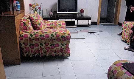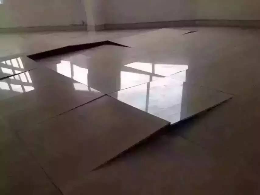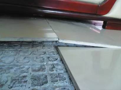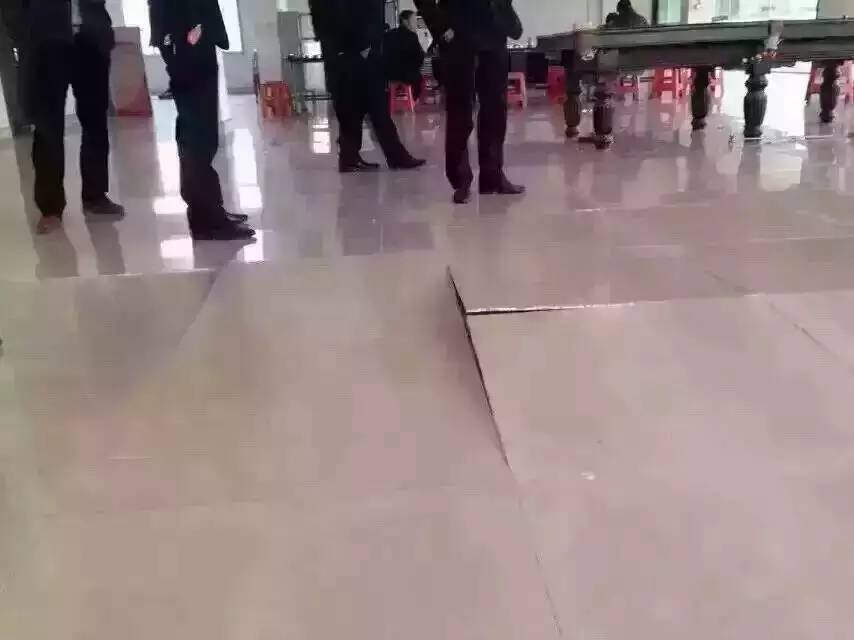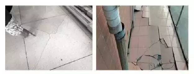 有圖有真相:無縫鋪貼的后果。北方某省某地飯廳某品牌拋光磚因不留縫鋪貼造成的嚴重后果。
