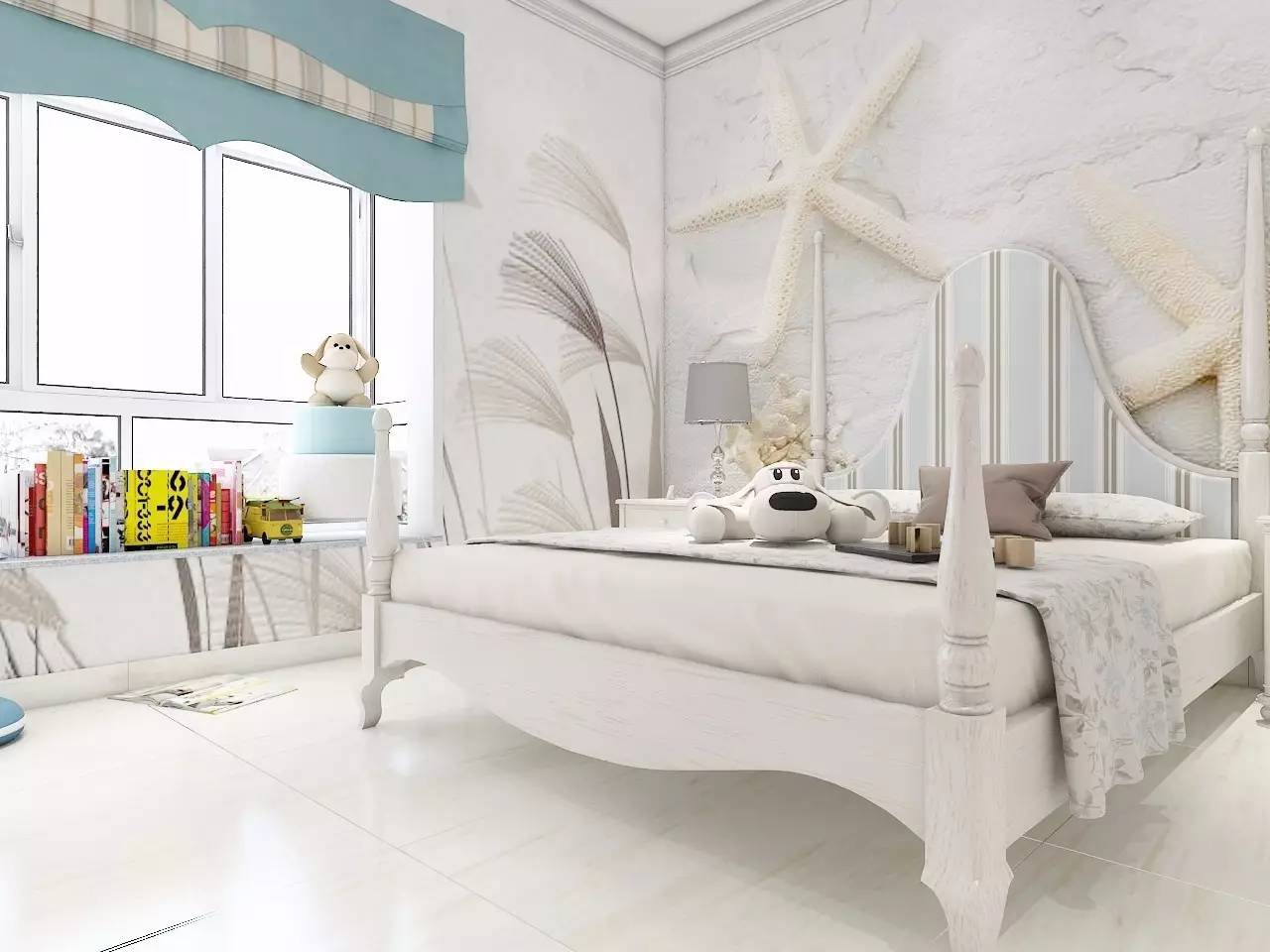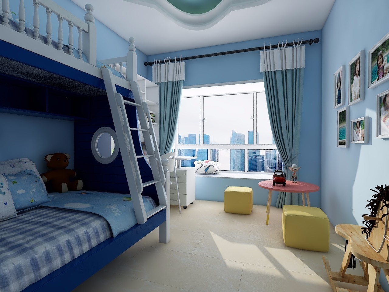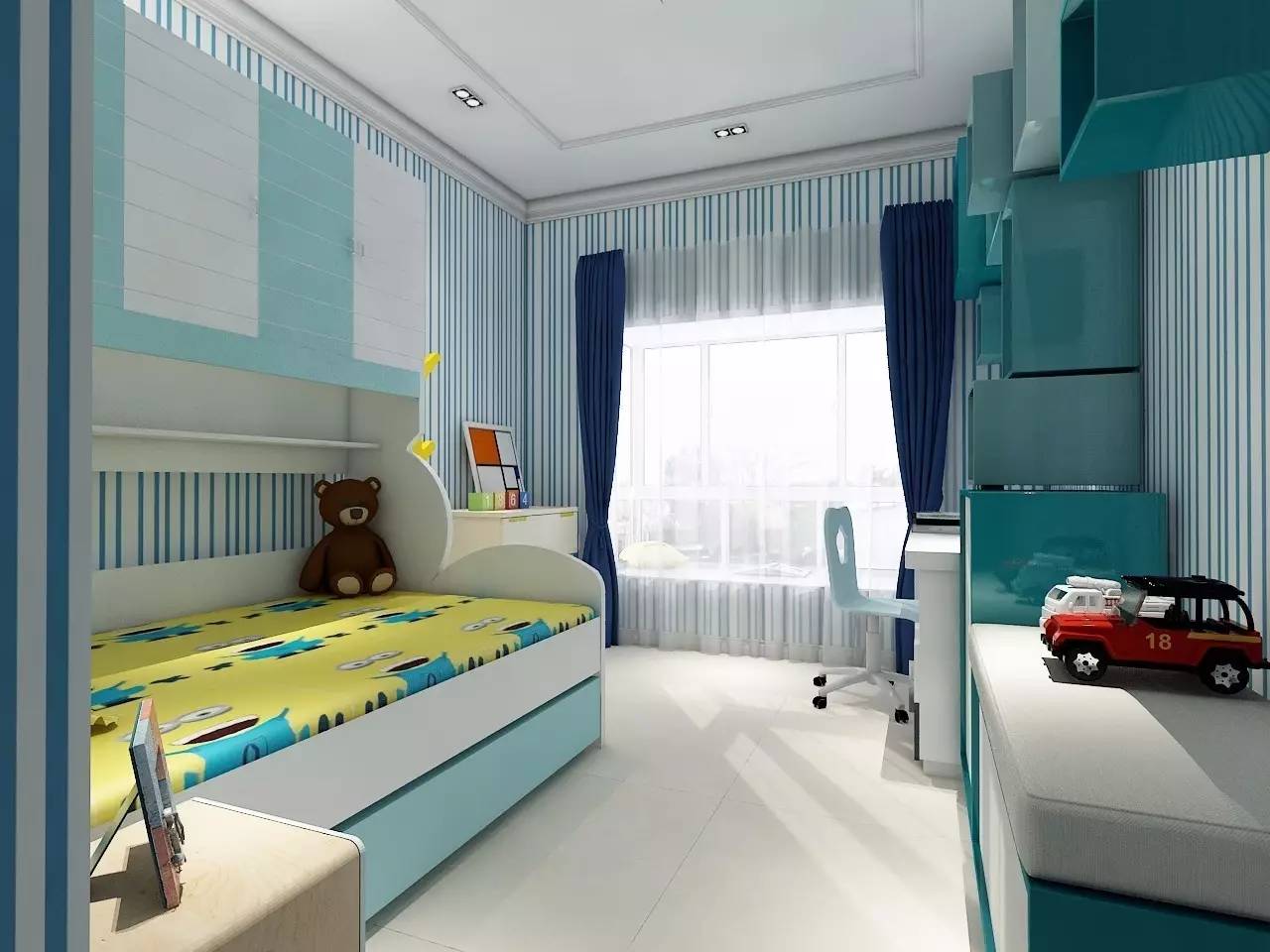 ▲主色調選擇簡單干凈的藍色+白色,這樣的空間,有助于調節孩子亢奮的情緒。