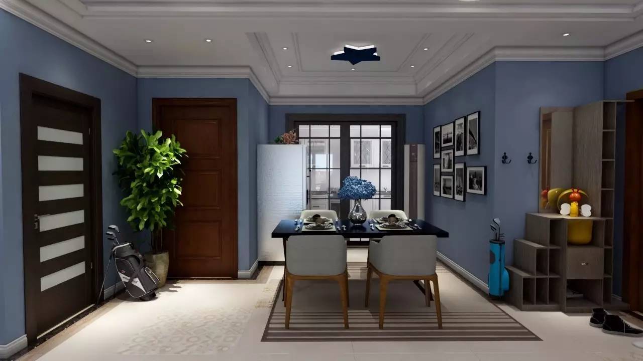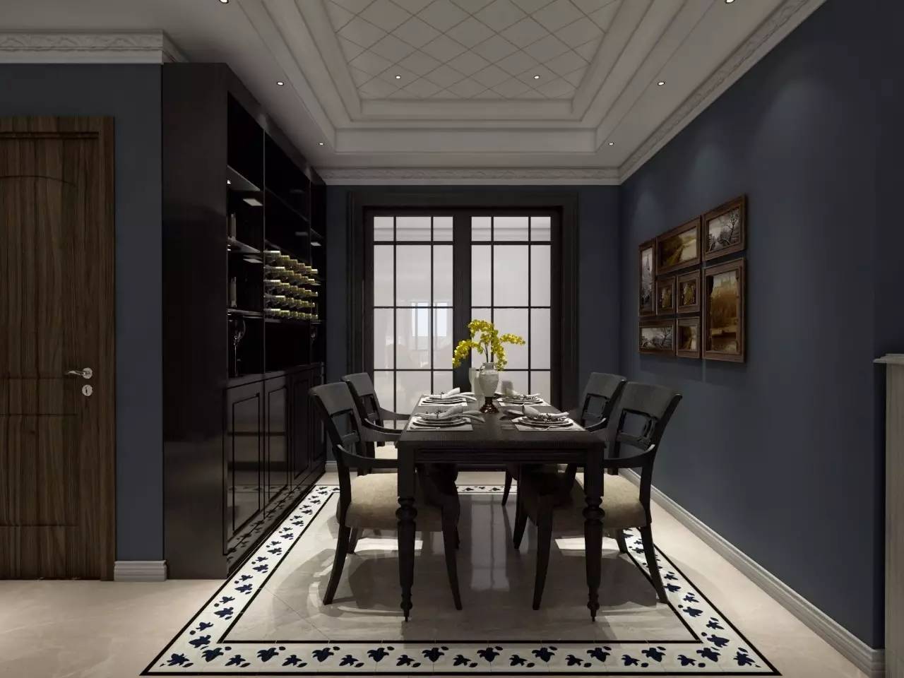 ▲飯廳深藍(lán)色的色調(diào)與中式家具相映襯,共同營(yíng)造摩登雅致的就餐空間。