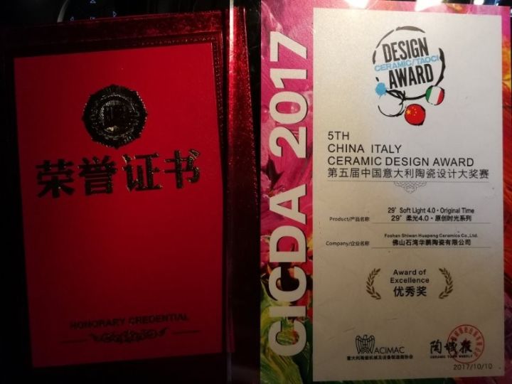 來自全國各地陶瓷品牌領軍人物與意大利一眾專家學者們匯聚一堂,近百家產品參與本次評選。華鵬29°柔光原創時光系列憑借立體感磚面、豐富的花色和紋理以及技術革新等方面的不斷追求,在本次中意陶瓷設計大賽贏得中國和意大利專家評審團的一致好評,榮膺“第五屆中意陶瓷設計大賽優秀獎”。
