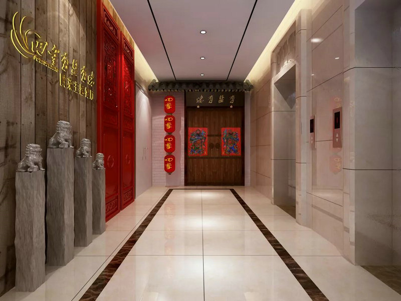 走廊的一側墻壁是由陜西八大怪的剪紙裝裱成的掛畫,另一側 墻則是用現代手繪方式繪制的古代餐飲圖案。在這里,傳統文化與現代創意交相呼應!將整個空間在視覺上給人以強烈的沖擊