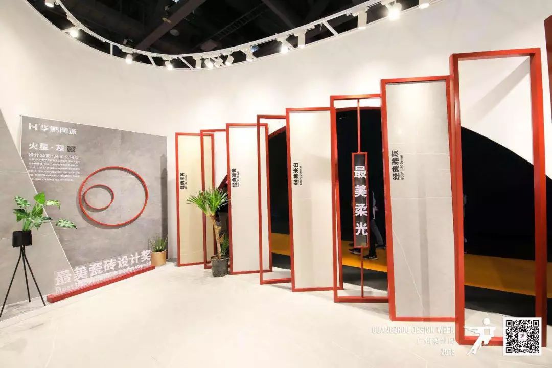姚總:整個展館的功能是三個板塊,一個是瓷磚展區,還有是最美瓷磚設計獎和設計創造價值精英人物獎的展區。整個展館核心是柔光磚,線條用傳統的鋼用線條,再扭曲變成弧形的,來跟我們產品的“柔”做一個結合,結合華鵬主題紅色,整個展區布局看似錯亂,其實存在著許多創意妙想,每一個弧形的結構其實是在銜接著每個展區。