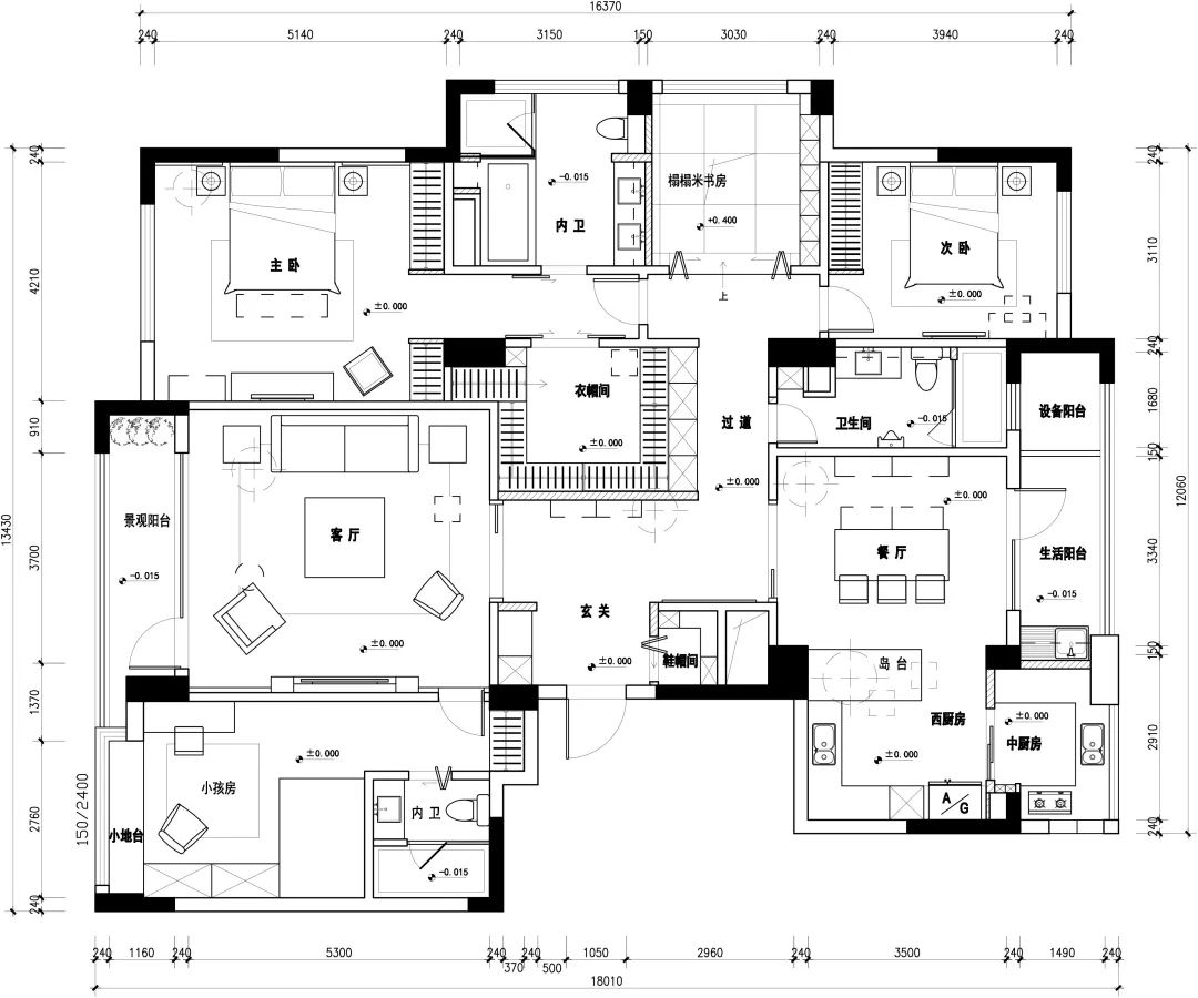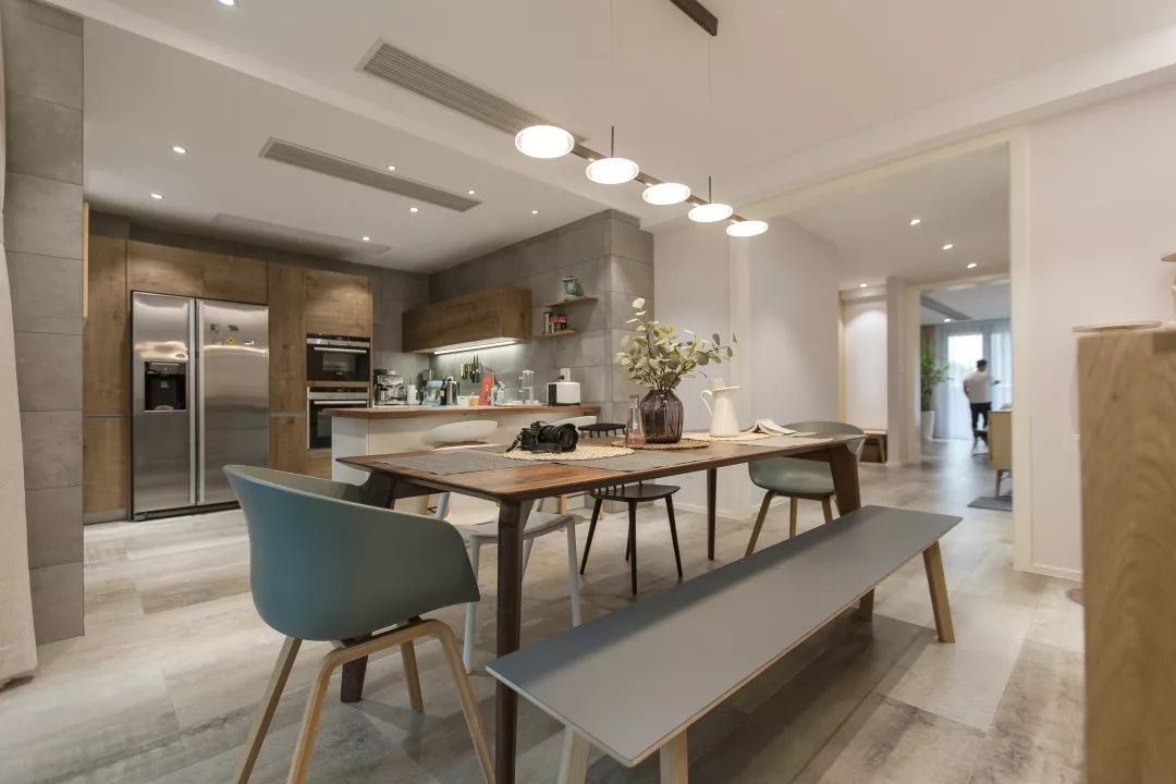 因為本案是一個熱愛旅行和美食的家庭,所以在布局上以廚房和餐廳作為整個家的核心。整個廚房空間被設計師劃分為中式廚房和西式廚房,既滿足了主人對不同美食的喜愛,也可以讓整個空間充滿家的味道。