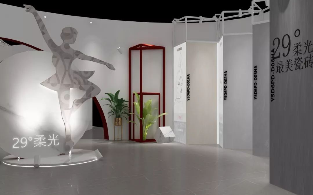 >>>品牌區(qū),設(shè)計(jì)師打破固有的元素組合,把產(chǎn)品與品牌文化、空間進(jìn)行結(jié)合,以華鵬柔光磚打造的芭蕾舞者造型平衡瓷磚的厚重感,從而賦予空間更多靈動(dòng)之美,讓瓷磚產(chǎn)品在設(shè)計(jì)中隱現(xiàn)俏皮之態(tài)