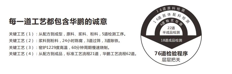 華鵬陶瓷25年始終如一,執著于對產品質量的追求,嚴格遵照專業化生產原則,原料上精挑細選,工藝上精益求精,每一片瓷磚,從設計到成品,歷經76道工藝的精心打造,數十項物理性能和表面效果把關。76道匠心品控,四大關鍵工藝,鑄就華鵬25年口碑。