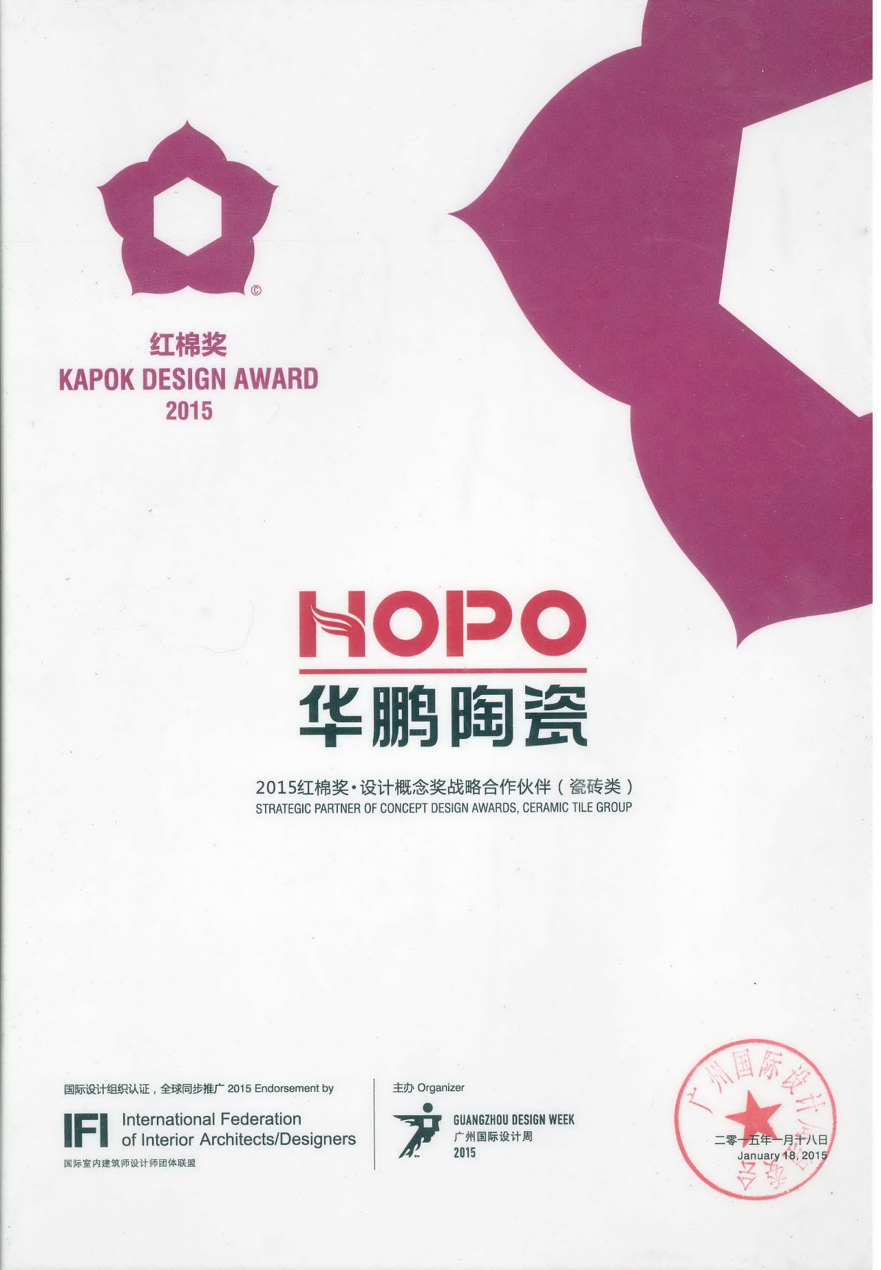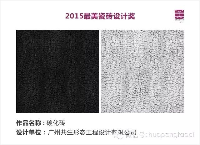 2015年,華鵬與廣州設計周合作,紅棉獎•設計概念獎首個專題獎項落定瓷磚產品領域,命名為“最美瓷磚設計獎”,公開征集“最美”的瓷磚產品設計概念方案,其中最美瓷磚設計獎獲獎作品由華鵬打版生產,轉化成瓷磚產品,使用在設計師的項目中,真正將設計和產業結合起來。