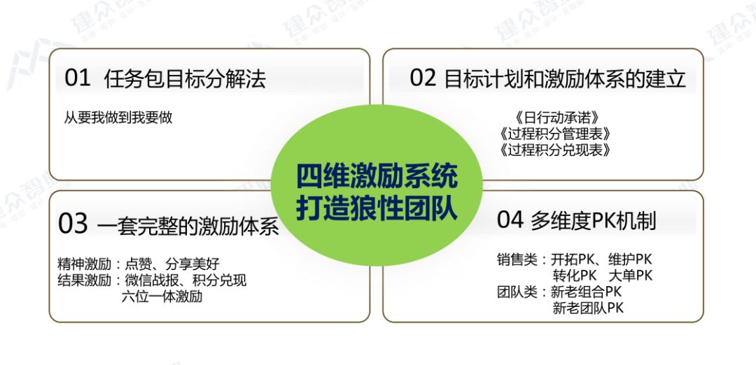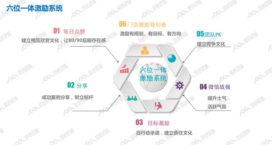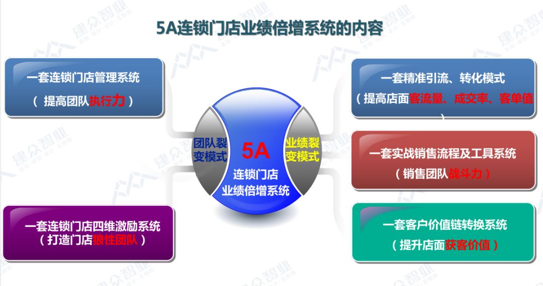 升成交率、客單值)、連鎖門店四維激勵系統(打造狼性團隊)、客戶價值鏈轉換系統(提升店面獲客價值)五大部分。