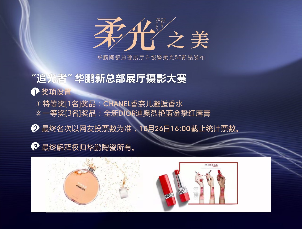 10月17日,華鵬陶瓷柔光5.0奢石系列新品全球發布,華鵬新總部展廳也正式同步對外開放,“追光者”華鵬新總部展廳攝影大賽同期舉行。