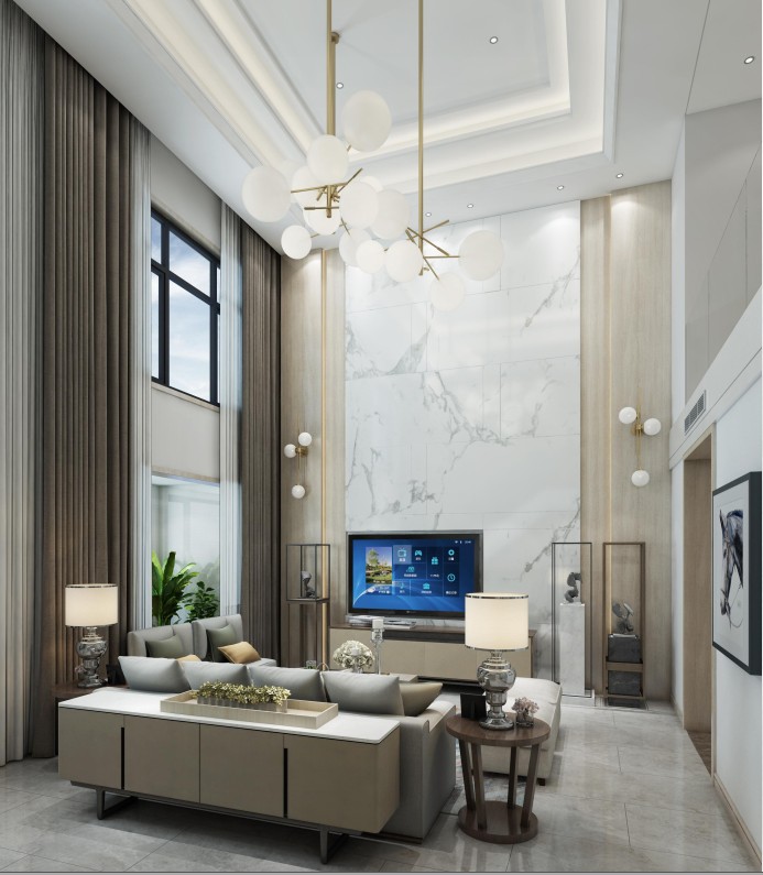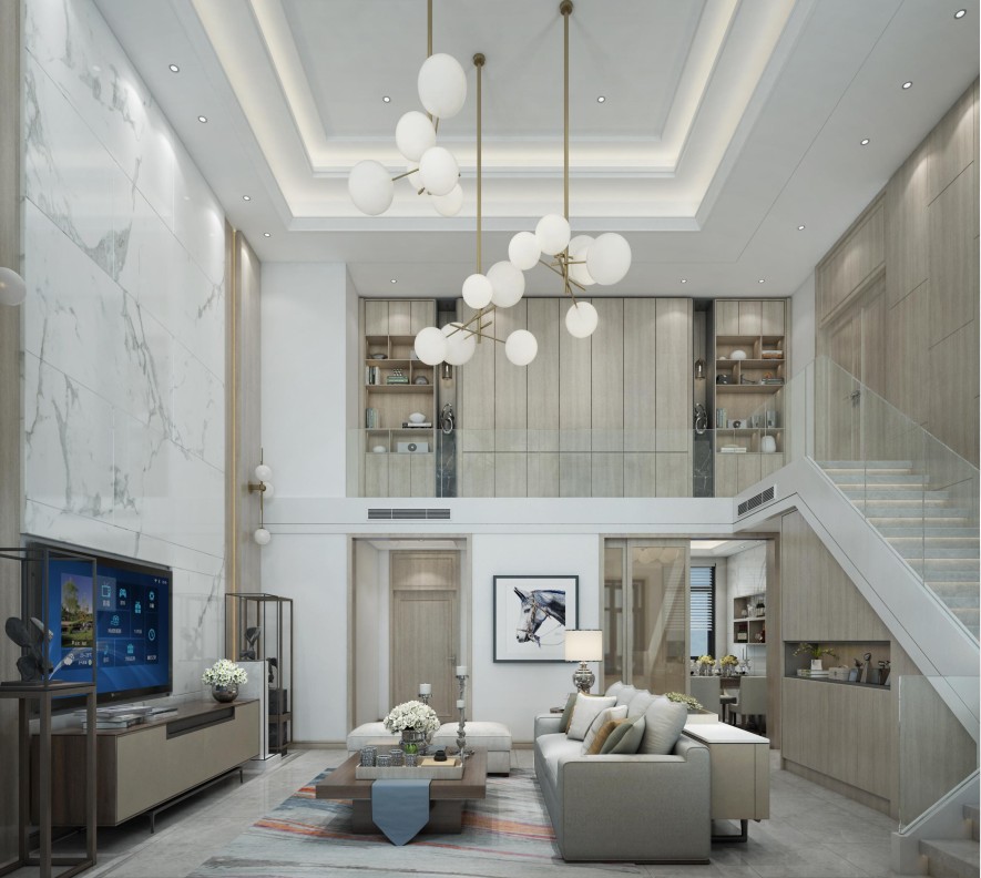 第二個方案是漯河西城西溪花園,是我們今年做過的最滿意的方案,它的面積只有201平方,是個復式挑空的結構,客廳區域通過樓梯通向2樓。這個方案有一個特別大的難點在于它的結構視覺中心不在主體上,發生了遷移,這造成了天花和地面不規整。我們最終通過一組圓形的燈把這個問題進行了弱化。
