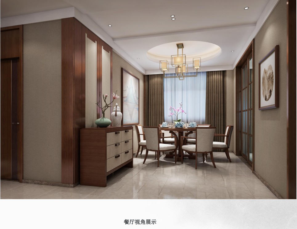 方案采用了亮一些的背景,整體色調則是中規中矩,偏深一些的色調;地面上我們采取了很多討巧的做法,比如同樣的磚用了不同的工藝,把餐廳客廳走廊的區域進行了區分,餐廳的區域感覺比較小,但是實際感受是非常舒服的。