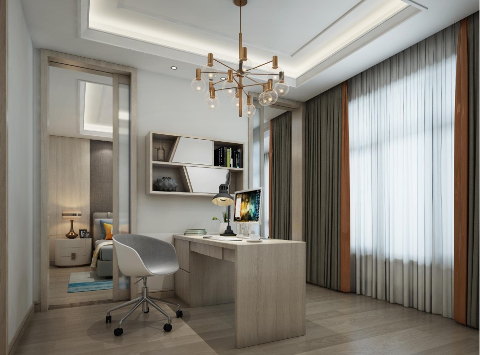 書房和臥室設計我們考慮到一個聯動,平時這是兩個獨立的空間,但是平常我們需要它敞開的時候,可以把門藏進去,形成一個空間。