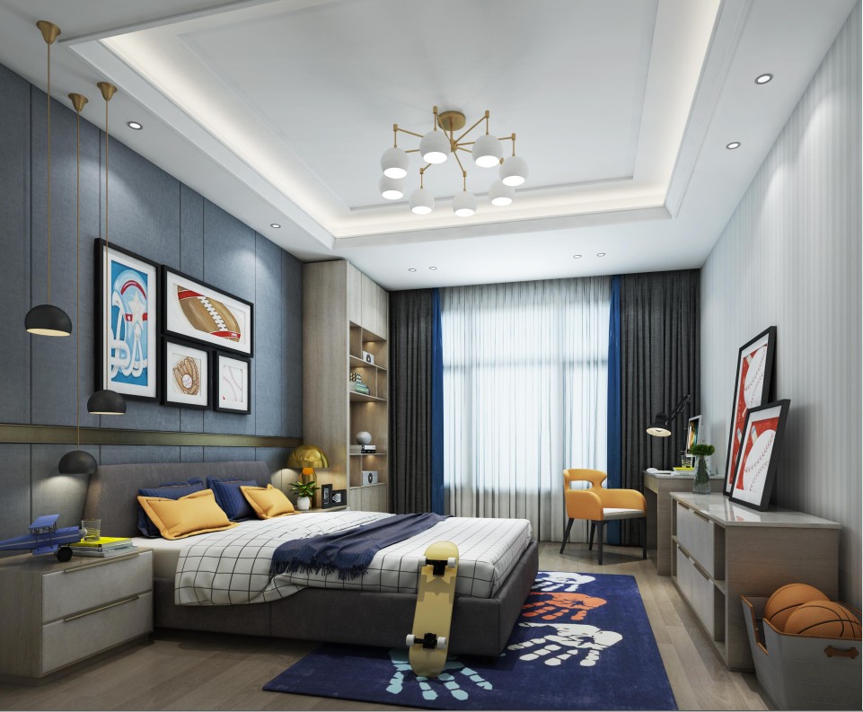 業主家的小男孩,很喜歡籃球的配飾,軟裝配飾上采用了灰藍色。我們在所有的石膏線上進行了定制和簡化,為了讓人更舒服。