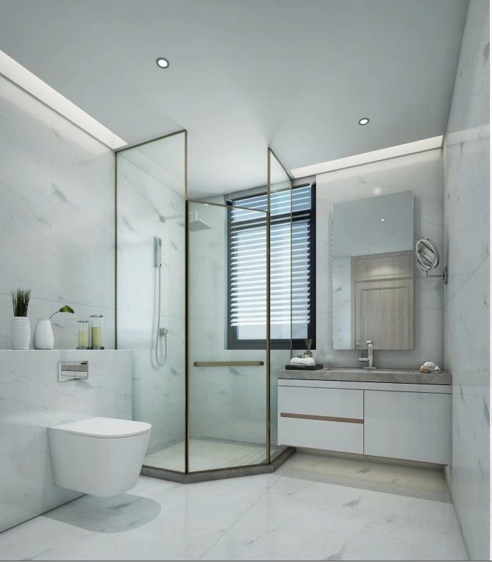 衛生間所有的磚是豎著鋪的,同樣的材料我們通過改變它的工藝,可以造成不一樣的效果。另外,在衛生間排水系統處理上,我更傾向于使用450×900mm或者600×1200mm的大規格磚超過300×300mm小磚,并且使用雙地漏,這樣排水的效率會提升很多。如果條件允許,也推薦大家采用壁掛式馬桶,好用、漂亮也夠檔次。