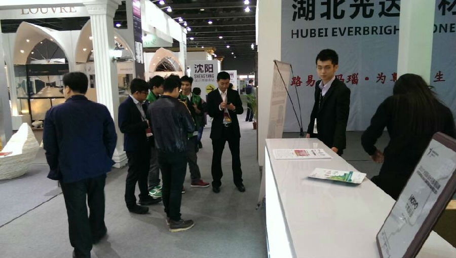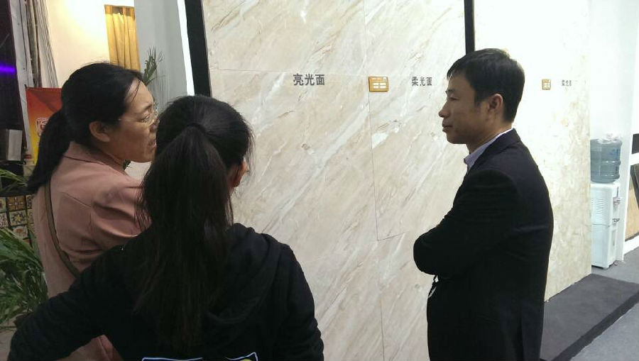 HOPO精英在給來訪設計師一對一講解,華鵬拳頭產(chǎn)品29°柔光石材的產(chǎn)品優(yōu)勢。