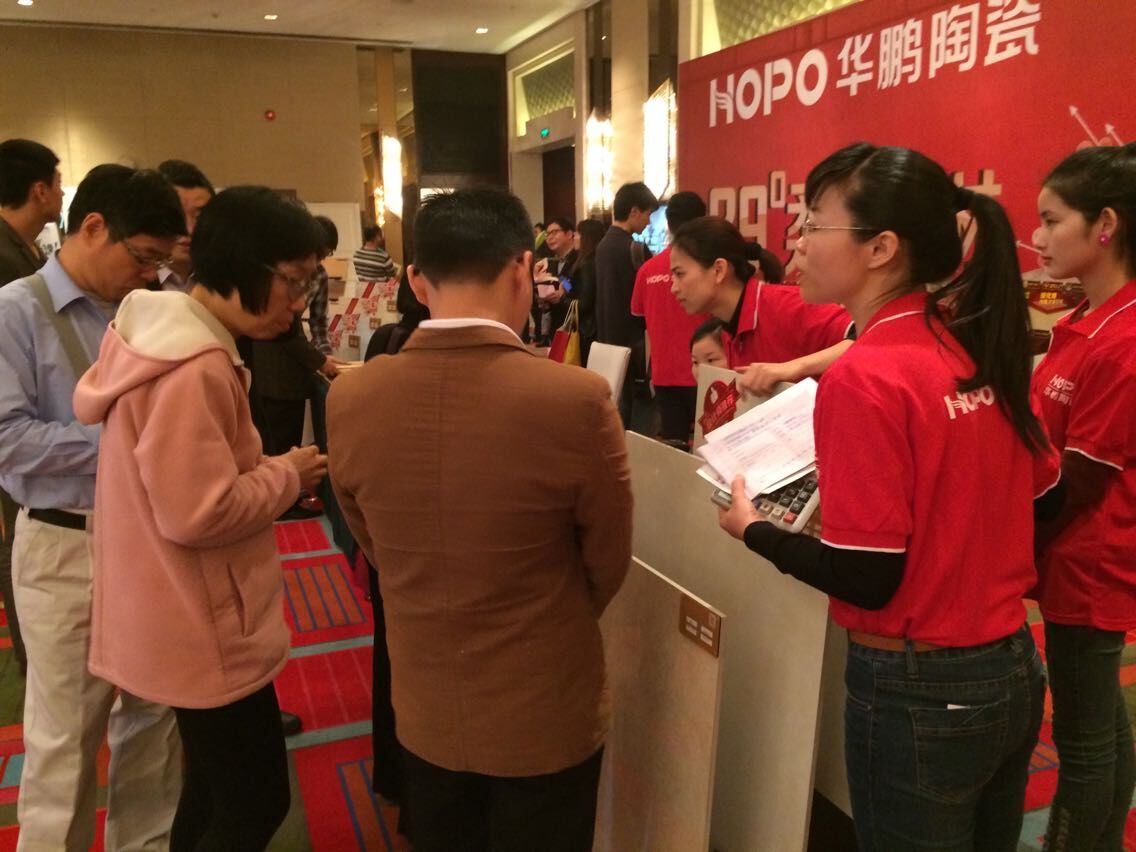 HOPO華鵬陶瓷展位現場,人潮簇擁,客戶們爭先恐龍向導購員詢問產品優(yōu)惠力度。