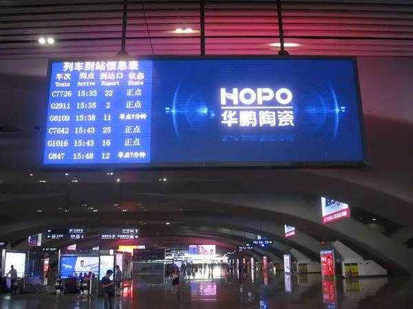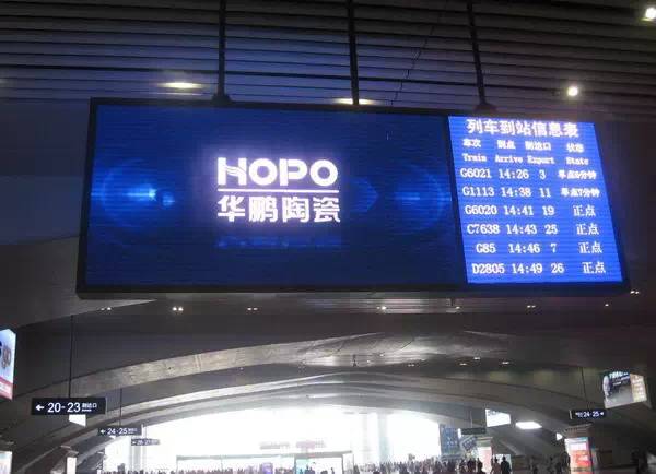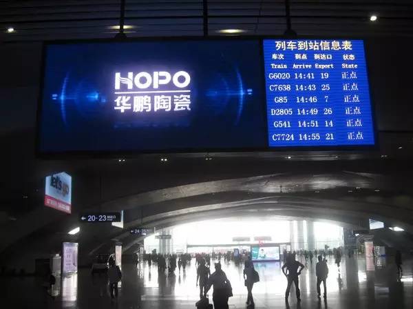 如今是高鐵時代,華鵬陶瓷選擇高鐵候車廳室內視頻和數碼刷屏作為傳播媒體,在廣州南這個戰略站點投放,品牌得到高度曝光。品牌推廣語以大氣鮮明的形象,齊齊閃耀在規模化分布的站點廣告及站出入口。偌大的候車廳,規模化矗立的數碼刷屏,強勢有力的品牌宣言,在空間上形成氣勢如虹的合力,以不可抵擋的恢宏氣息,給消費者強大的視覺沖擊,將品牌深刻印記在消費者的腦海。