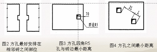 7、盡量將電閘盒方孔安排在兩塊磚之間接縫的兩側(cè),亦即避免在磚片內(nèi)部開孔。當(dāng)磚片內(nèi)部開設(shè)電閘盒方孔不可避免時,則孔邊與磚側(cè)邊的距離不應(yīng)小于70mm。如同一塊磚內(nèi)開兩個以上方孔,則易發(fā)生兩孔內(nèi)側(cè)的鄰角頂點之間形成裂紋的情況,應(yīng)該避免;如實在必須,則兩孔鄰角間直線距離須達(dá)到方孔對角線長度的兩倍以上。