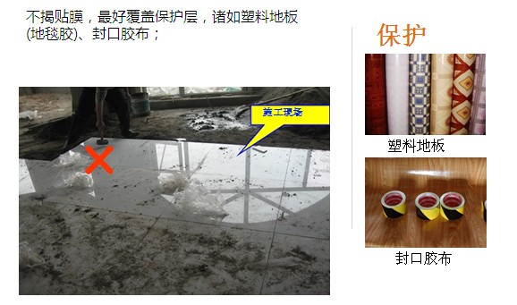 表面層:出廠前已貼好的表面保護(hù)膠膜,不但防止污染更能阻止沙粒劃傷。無論是干掛或者鋪貼,都一定要堅持到竣工并徹底清潔處理之后,才揭掉此保護(hù)膜。如磚面沒有保護(hù)膠膜,則應(yīng)該及時在磚面上覆蓋如3mm-4mm厚紙板、地毯膠或木夾板保護(hù)。