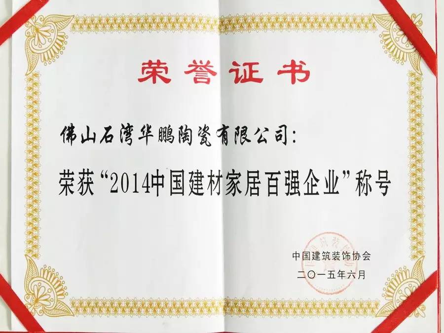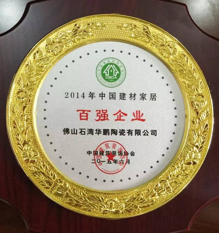 6月28日下午,在中國裝飾協(xié)會領(lǐng)導代表、行業(yè)專家、企業(yè)負責人和設(shè)計師逾千人的共同見證下,華鵬瓷磚榮獲中國建材家居企業(yè)100強榮譽稱號,再一次展示了華鵬陶瓷非凡的品牌實力。