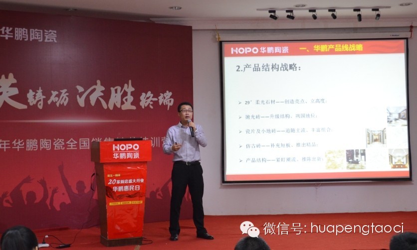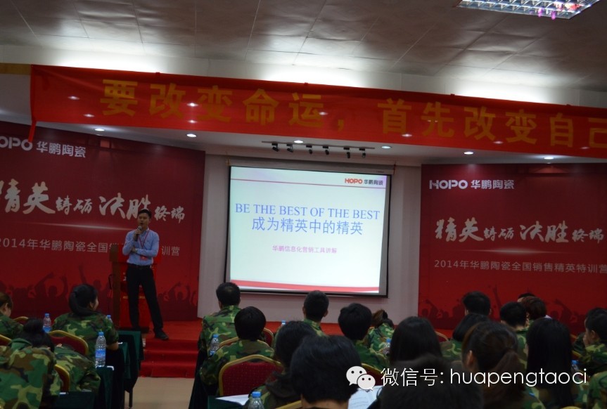 今天華鵬為精英們準備的集訓內容主要是知識講座,華鵬陶瓷總經理姚松榕先生率先為大家帶來了《2014年HOPO營銷規劃》,緊接著副總經理楊勇先生為大家解讀了《華鵬陶瓷產品體系》。現場學習氣氛十分濃烈,學員們聚精會神、踴躍提問、爭相竟答,一次次將現場氣氛掀至高潮。