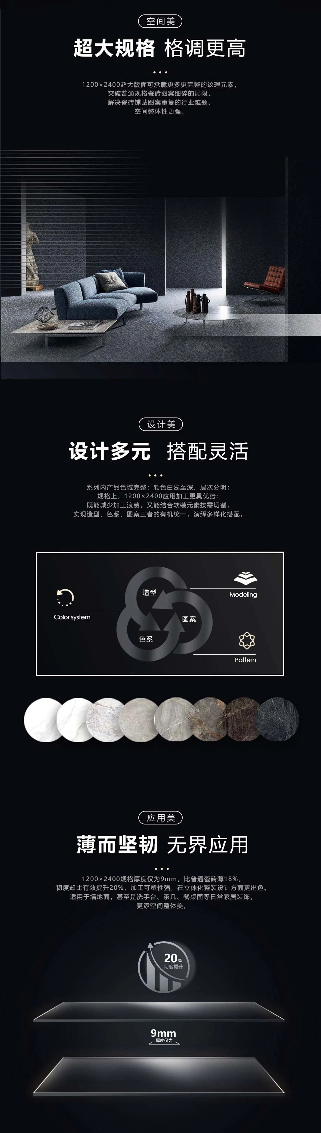 華鵬陶瓷擁有全系列產品線,價格覆蓋高中低層面,滿足設計師渠道,家裝渠道,零售渠道,整裝工裝渠道多方面需求。