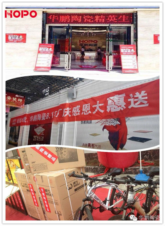 在集團40年之際,華鵬舉行了為期一月的全國聯動的優惠盛宴,據悉,為了與消費者一起慶祝40歲生日,在8.18當天,消費者只要進店在華鵬慶生KT板上簽名,就可獲得華鵬40年特別禮品,除此之外,更是拿出數十款產品進行廠慶大放價,全場幾十款產品5折封頂,還設置了萬元現金抓的環節。在走訪山東、深圳、河南、江西、廣州、北京的過程中,各大經銷商除了會按照四十周年廠慶標準方案執行外,很多會根據自己的實際情況,投入參加各種家裝博覽會,組織各種設計師活動等。為傳統銷售淡季增添了濃墨重彩的一筆。