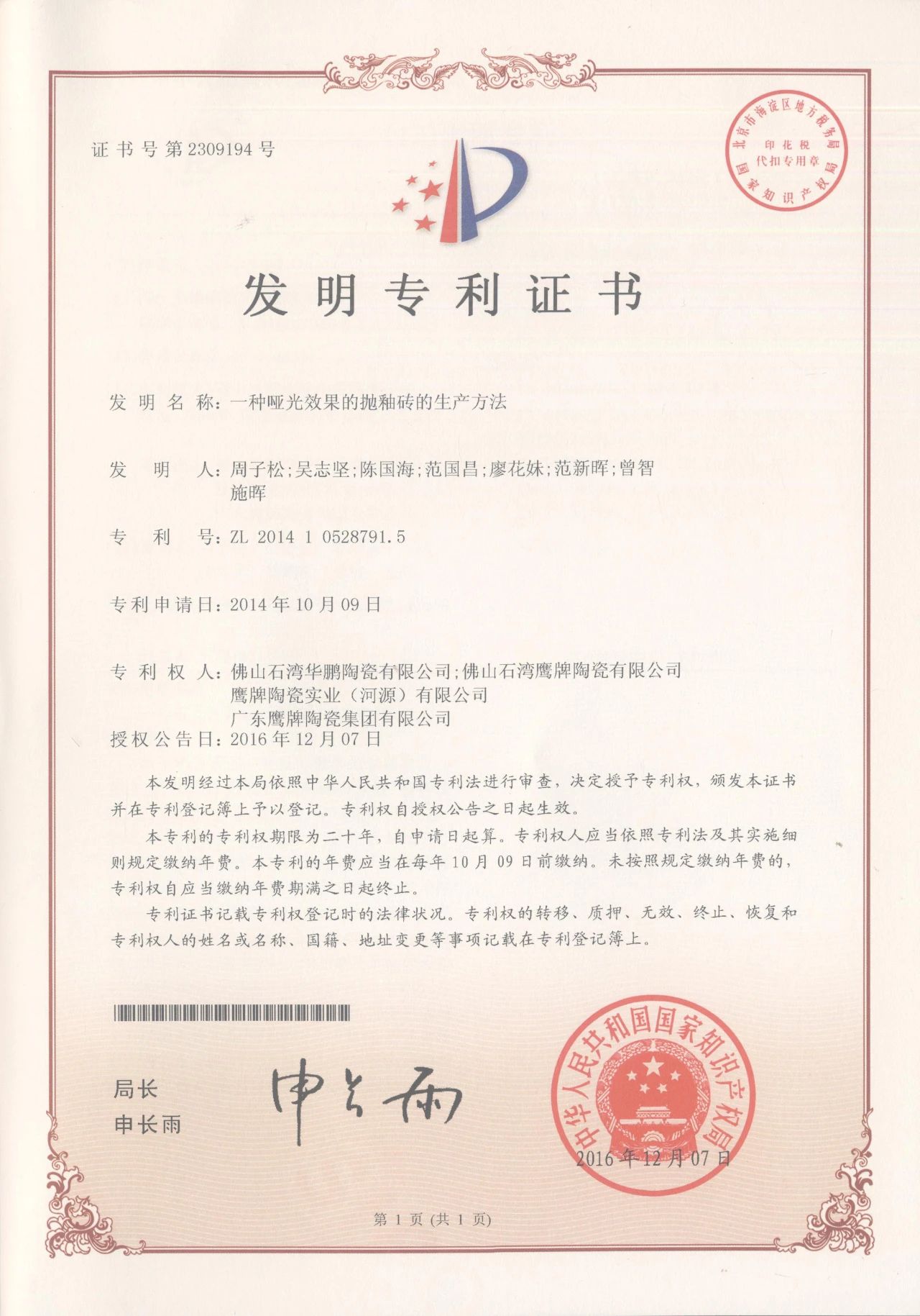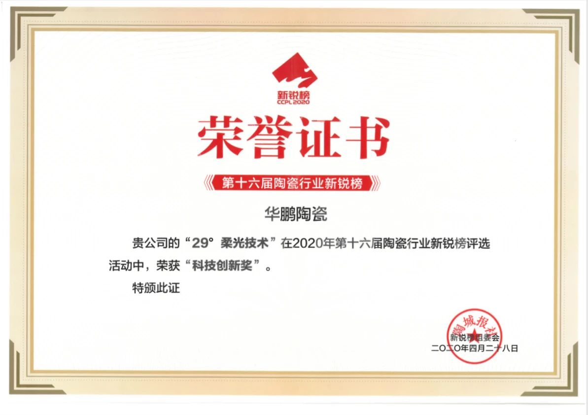 2016 年,華鵬 29°柔光技術獲“發明專利證書”,標志著行業柔光磚標準正式形成,同時 也確定了華鵬“柔光磚領導品牌”定位。