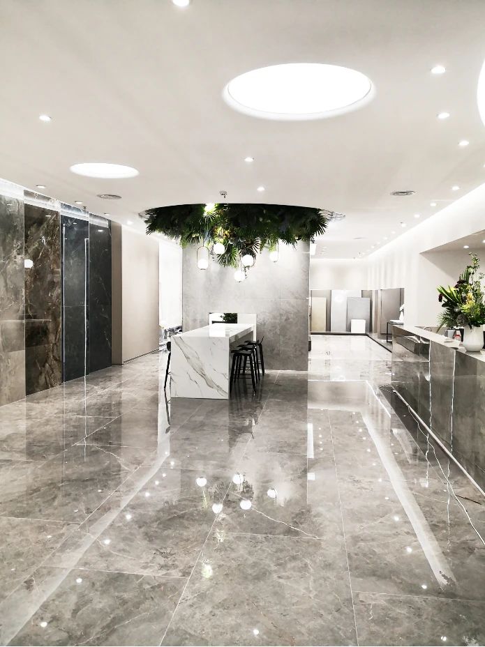 以珍奢石材為創作概念,通過稀“有紋理+完整色域+不同處理工藝”的精細規劃,“晶石干粒定位+ 多層智控柔拋+專屬通體色坯+黃金規格”的疊加,將多種晶石干粒精準定位于磚面,1229℃高溫讓晶石干粒融 合再組,凝為寶石結晶。同時根據產品紋理細節,鑲嵌不同強度的模塊裝置,數十道智控柔拋工序,鍛造柔滑質感,實現產品由視覺到觸覺的延伸。最后呈現為 900×1800 的黃金規格,讓瓷磚更有溫度且更高級。