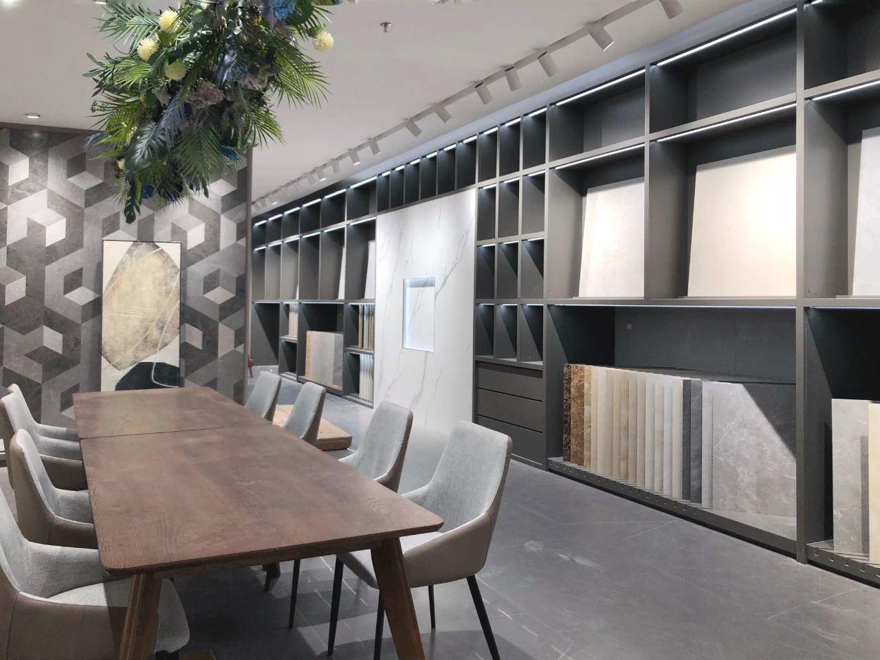 為了更好匹配華鵬的產品結構和產品陣容展示,新展廳一樓除公共空間外,全部被規劃為選材區。選材區直觀陣列式且有獨特韻律的展示布局,方便經銷商體驗品牌全方位產研實力。