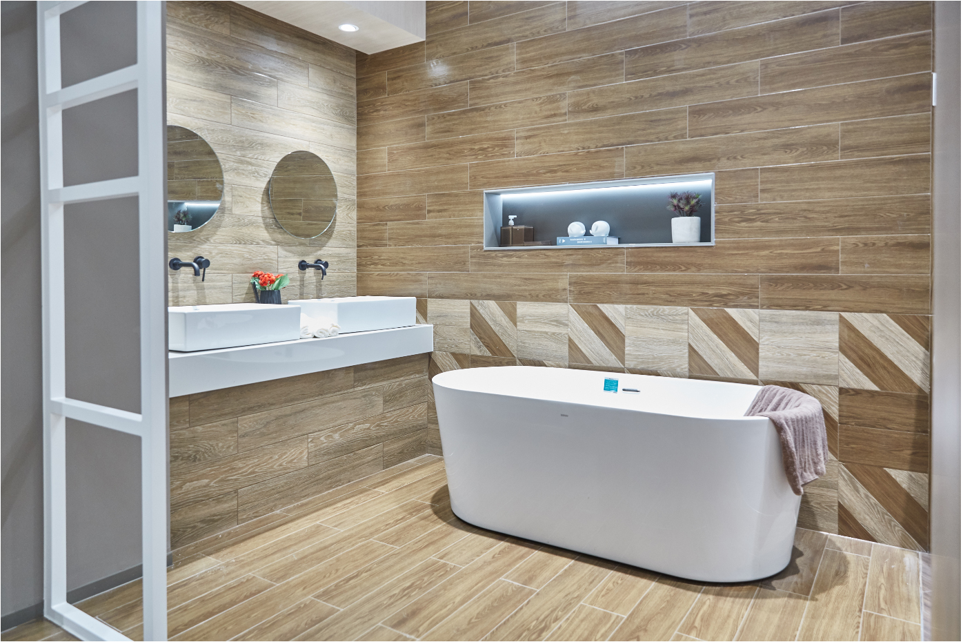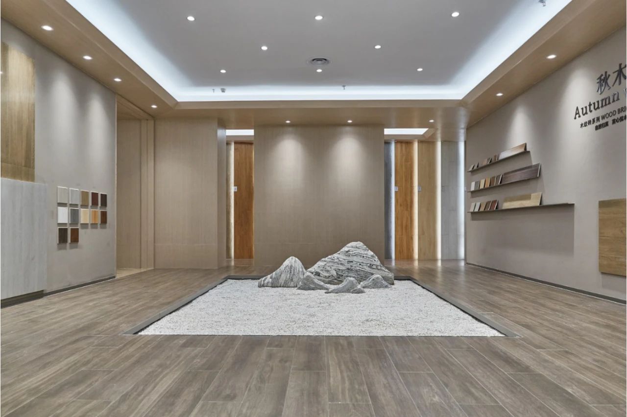 木紋館以四季之“秋”為主題,大量運用華鵬木紋磚進行呈現,木色的素凈舒心及通透本然的自然本色營造出仿如秋日楓林般的舒爽愜意,木紋磚上的紋理從世界各地珍稀木材中萃取而成,融合著秋日的沉穩之色,展現出對秋色的鐘情與大自然的向往。