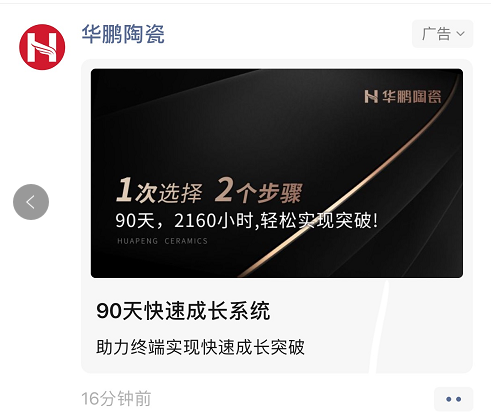 2021年,華鵬“1次選擇,2個步驟,90天實現(xiàn)快速盈利”招商主題,在微信朋友圈進(jìn)行轟炸式投放,在公域流量池讓更多的人觸達(dá)品牌。在春季陶博會期間,迎來一波簽約高潮,達(dá)到了精準(zhǔn)營銷目的