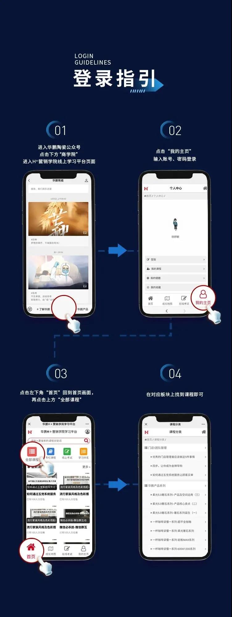 用戶可從華鵬陶瓷微信公眾號、小程序、官網(wǎng)多訪問入口,進(jìn)行定期“線上”培訓(xùn),PC端、移動端同時適配,微信公眾號底部菜單欄一鍵直達(dá),給終端帶來數(shù)字化時代更便捷的體驗,滿足隨時培訓(xùn)需求。