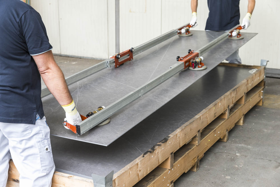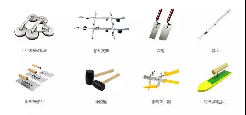 鋪貼之前,我們需要準(zhǔn)備好鋪貼大規(guī)格巖板的工具,如工業(yè)級瓷磚吸盤、移動(dòng)固定架、特制瓷磚防護(hù)移動(dòng)支架、輕質(zhì)塑膠錘、靠尺、鋼制摸漿刀、灰匙、瓷磚找平器、強(qiáng)力瓷磚粘結(jié)劑、海綿填縫刮刀、清潔海綿等。