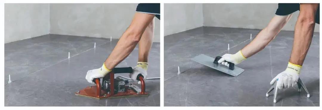 鋪貼一個(gè)小時(shí)后,可用橡膠錘敲擊板面,檢查是否出現(xiàn)空鼓現(xiàn)象。若聽到“空空”聲的地磚,必須設(shè)法重新鋪貼。大板/巖板鋪貼結(jié)束后24小時(shí),可進(jìn)行嵌縫施工。