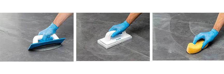 及時(shí)將殘留的膠黏劑和灰塵沙土清潔干凈,巖板鋪貼24小時(shí)后才能進(jìn)行美縫。美縫可使用海綿填縫刮刀對瓷磚縫隙進(jìn)行美縫處理,等待填縫劑固化后,清理多余的填縫劑。