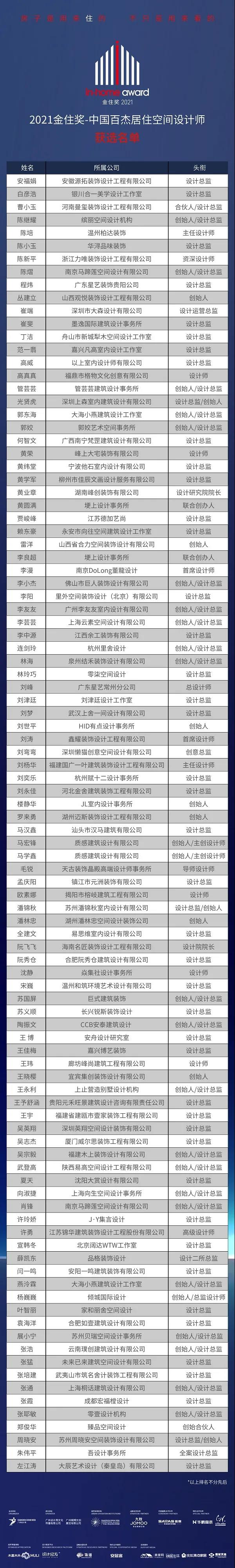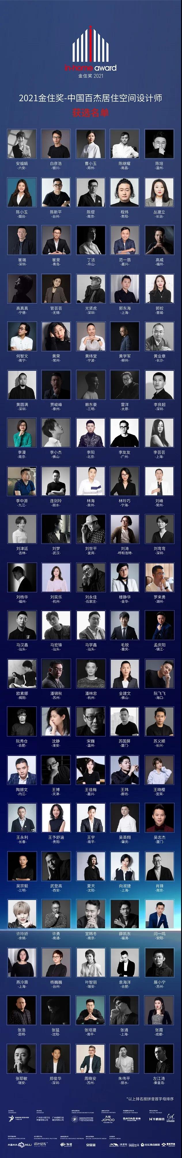 在評審委員會的嚴(yán)格評選之下,最終有來自100位優(yōu)秀設(shè)計師脫穎而出,登上“2021金住獎-中國百杰居住空間設(shè)計師”榮譽榜單,一起先睹為快!