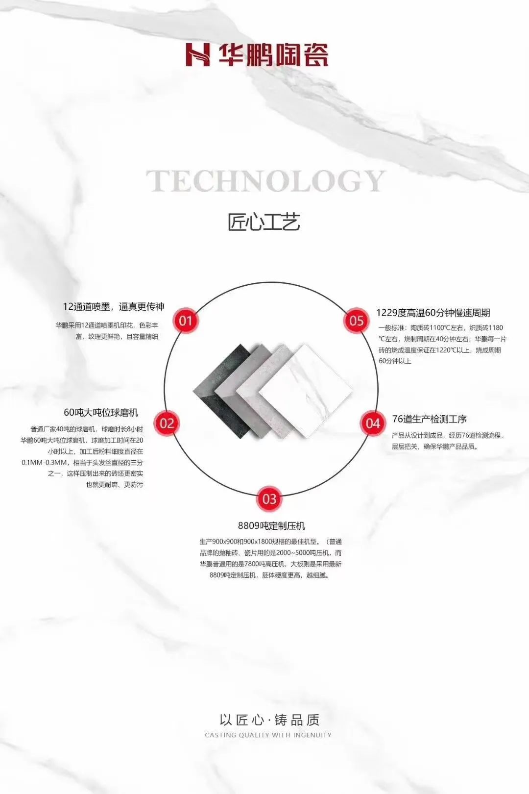 8809噸定制壓機;1229度高溫,60分鐘燒成周期;76道生產檢驗程序,確保華鵬