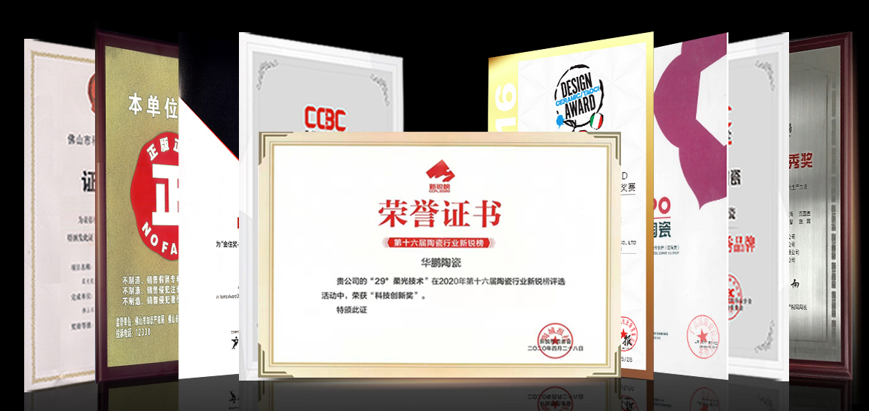 以實力鑄就行業口碑,榮獲“中國專利優秀獎”、“柔光瓷磚品類冠軍”、“品質金獎”、“單品類冠軍品牌”、“科技創新獎”、“第四屆中國意大利設計大賽金獎”、“第七屆中國意大利陶瓷設計大賽最佳趨勢產品獎”等。
