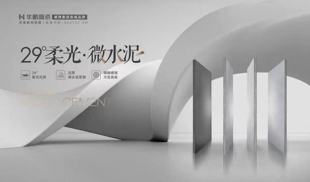2021年,微水泥風潮席卷行業內外,華鵬乘勢而起,突破性將“29°柔光技術”與微水泥產品設計相結合,重磅推出以750x1500mm、600x1200mm兩大規格為主的29°柔光微水泥系列,打造出獨有的產品特色,實現了產品在不同角度的光度投視下的面感、質感和觸感的多重提升。并通過高口碑、高頻次曝光,以及系統性的創新實踐,贏得了廣泛的行業關注和大眾認可,并為市場帶來了新的沖擊與思考。