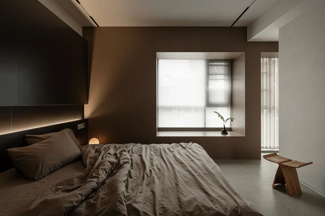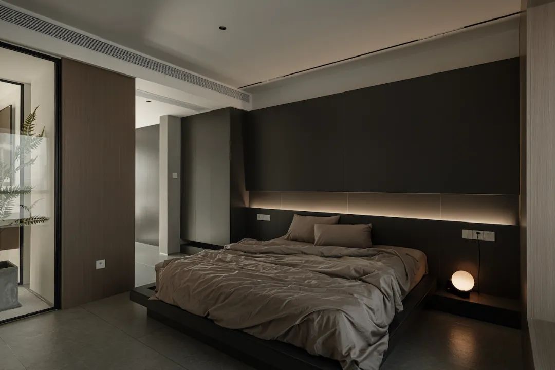 主臥的偏暗系設計,在身心層面提升舒適度及安全感,自然取材喚醒靜謐的美感,加之流動的線條,低調的設計,恰到好處地拿捏聆聽心聲的審美觀和沉浸式的詩意感。