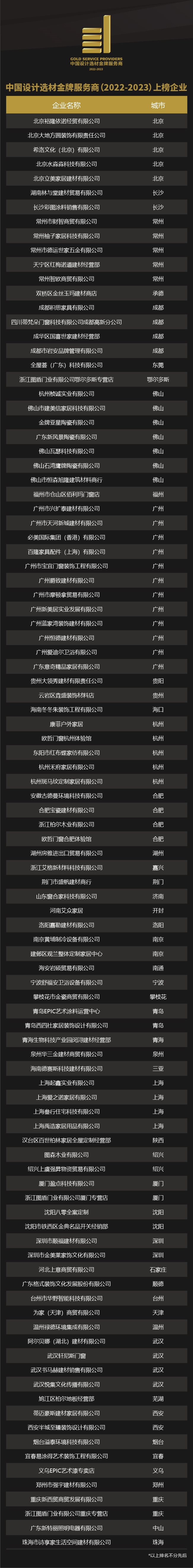 今年度,“中國設計選材金牌服務商(2022-2023)”評選活動,歷時四個多月,全國2000+家企業,400+品牌的報名參評,覆蓋200+地區,最終100家企業榮膺“中國設計選材金牌服務商(2022-2023)”殊榮。