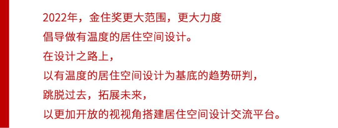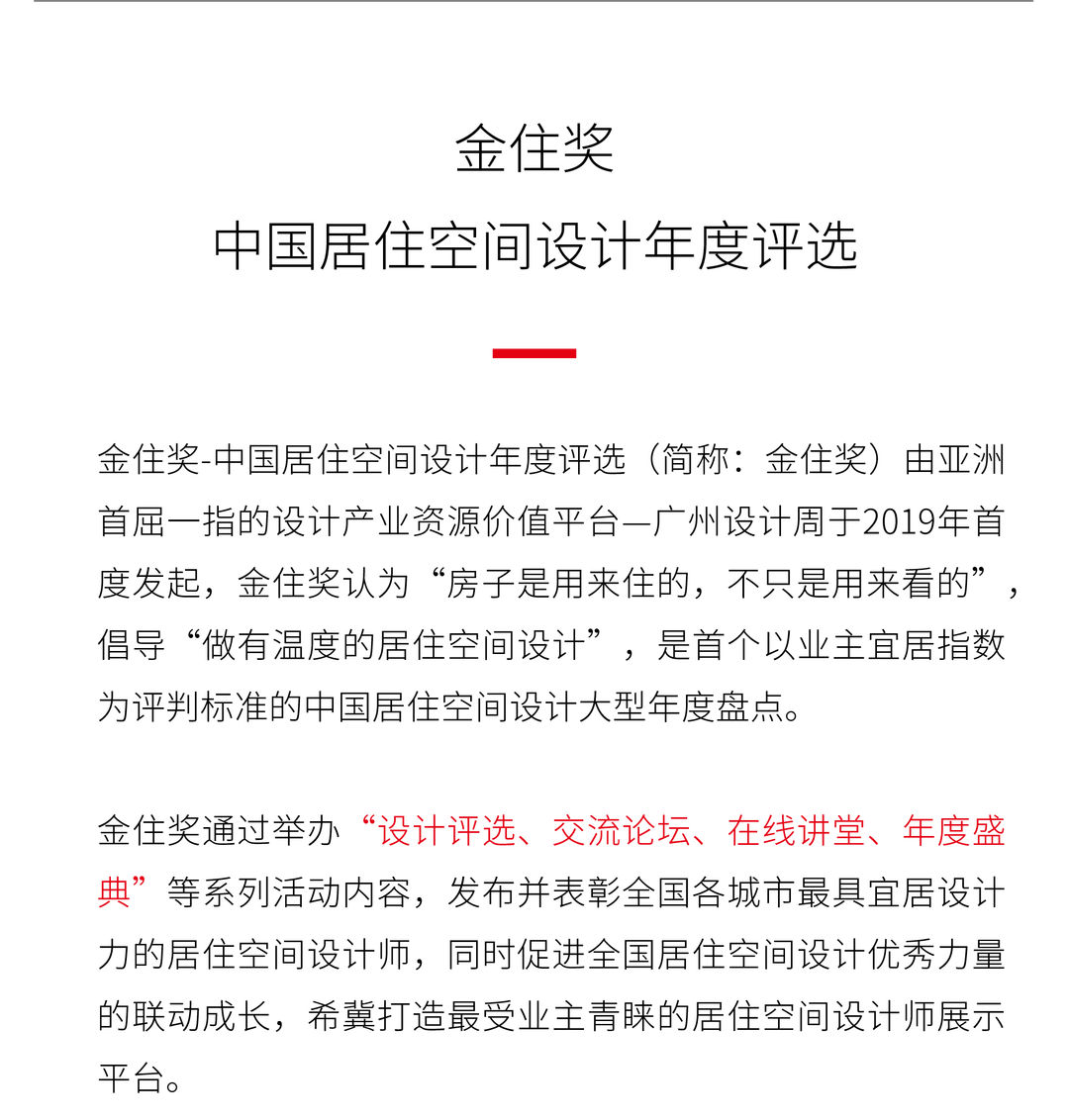 金住獎-中國居住空間設計年度評選(簡稱:金住獎)由亞洲首屈一指的設計產業資源價值平臺—廣州設計周于2019年首度發起,金住獎認為“房子是用來住的,不只是用來看的”,倡導“做有溫度的居住空間設計”,是首個以業主宜居指數為評判標準的中國居住空間設計師大型年度盤點。