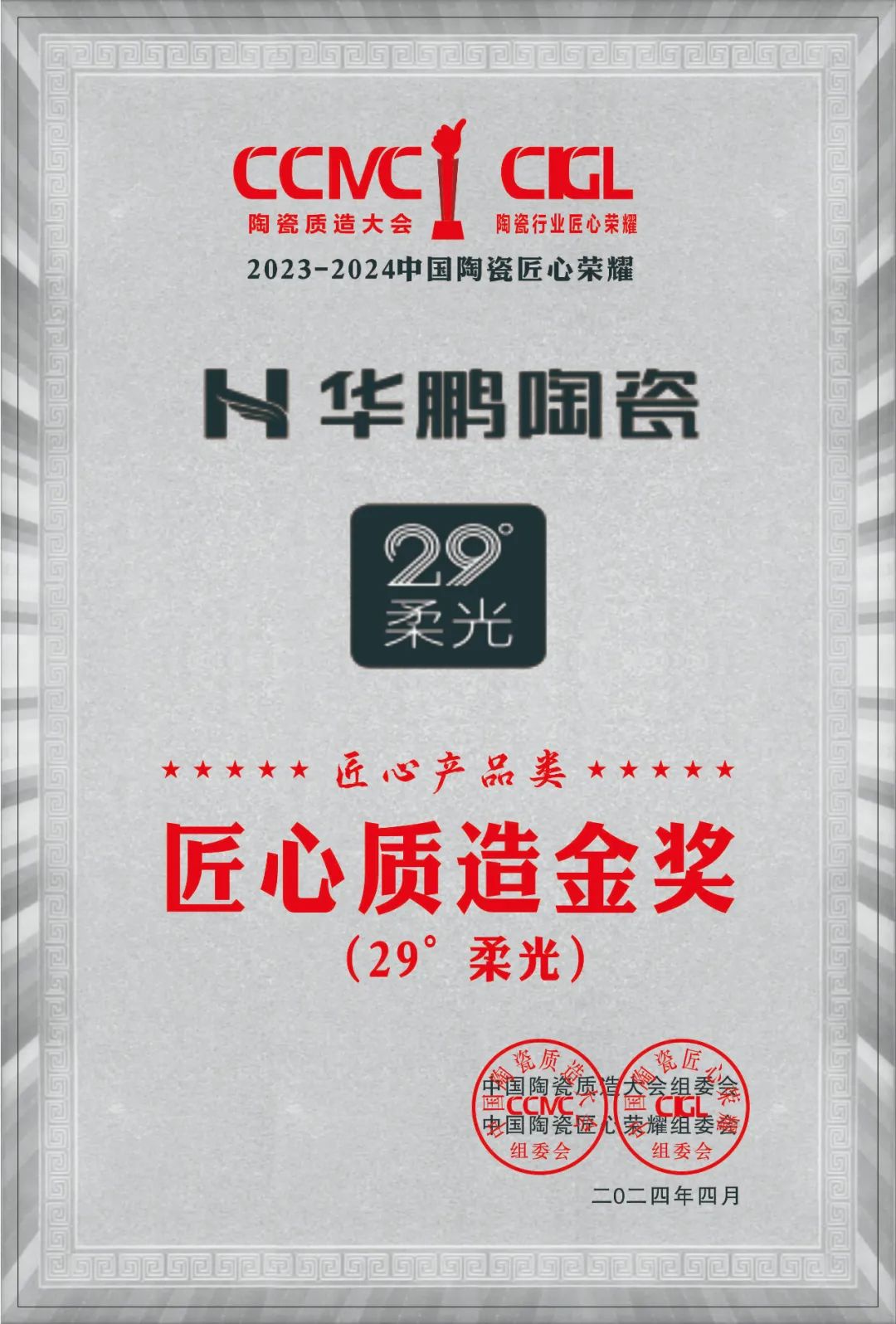 在本次質造大會上,華鵬陶瓷經過層層評選,憑借強大的產品研發創新力和品牌實力,斬獲了“匠心質造金獎(29°柔光)”這項大獎,展現了華鵬陶瓷在柔光領域的前瞻性及29°柔光產品的硬實力。