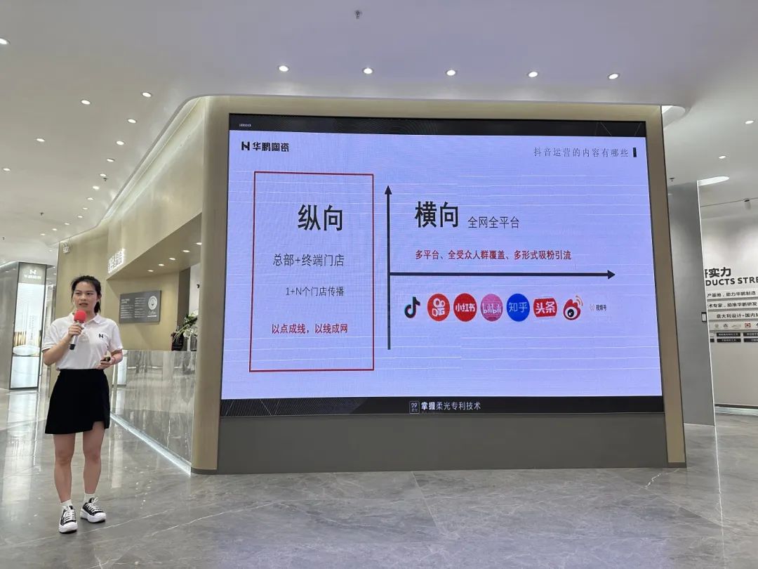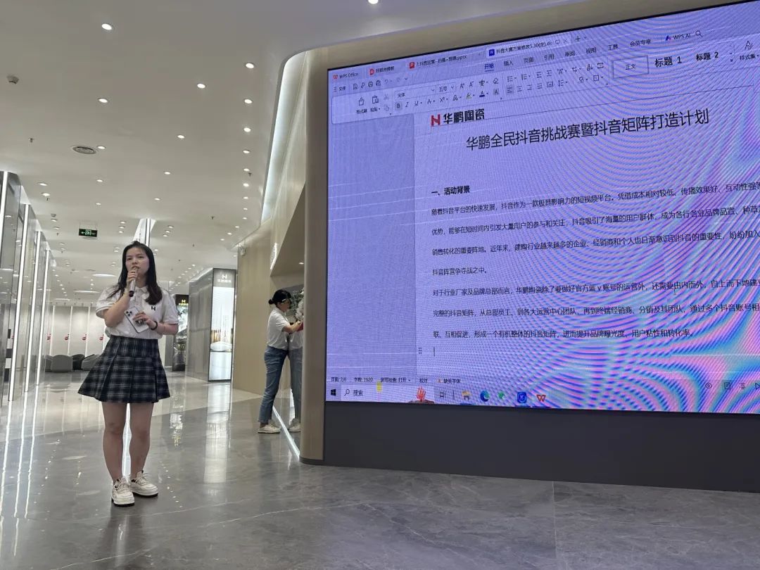 在會(huì)議的最后,市場(chǎng)部李翠云講解華鵬陶瓷6月重點(diǎn)營(yíng)銷項(xiàng)目——“好柔光 DOU出彩”2024華鵬陶瓷首屆全民抖音挑戰(zhàn)賽,通過(guò)發(fā)動(dòng)品牌內(nèi)部人員、全國(guó)銷區(qū)參賽,以不同形式的作品展現(xiàn)華鵬品牌魅力及產(chǎn)品特色,形成全員新媒體矩陣,助力品牌發(fā)聲!