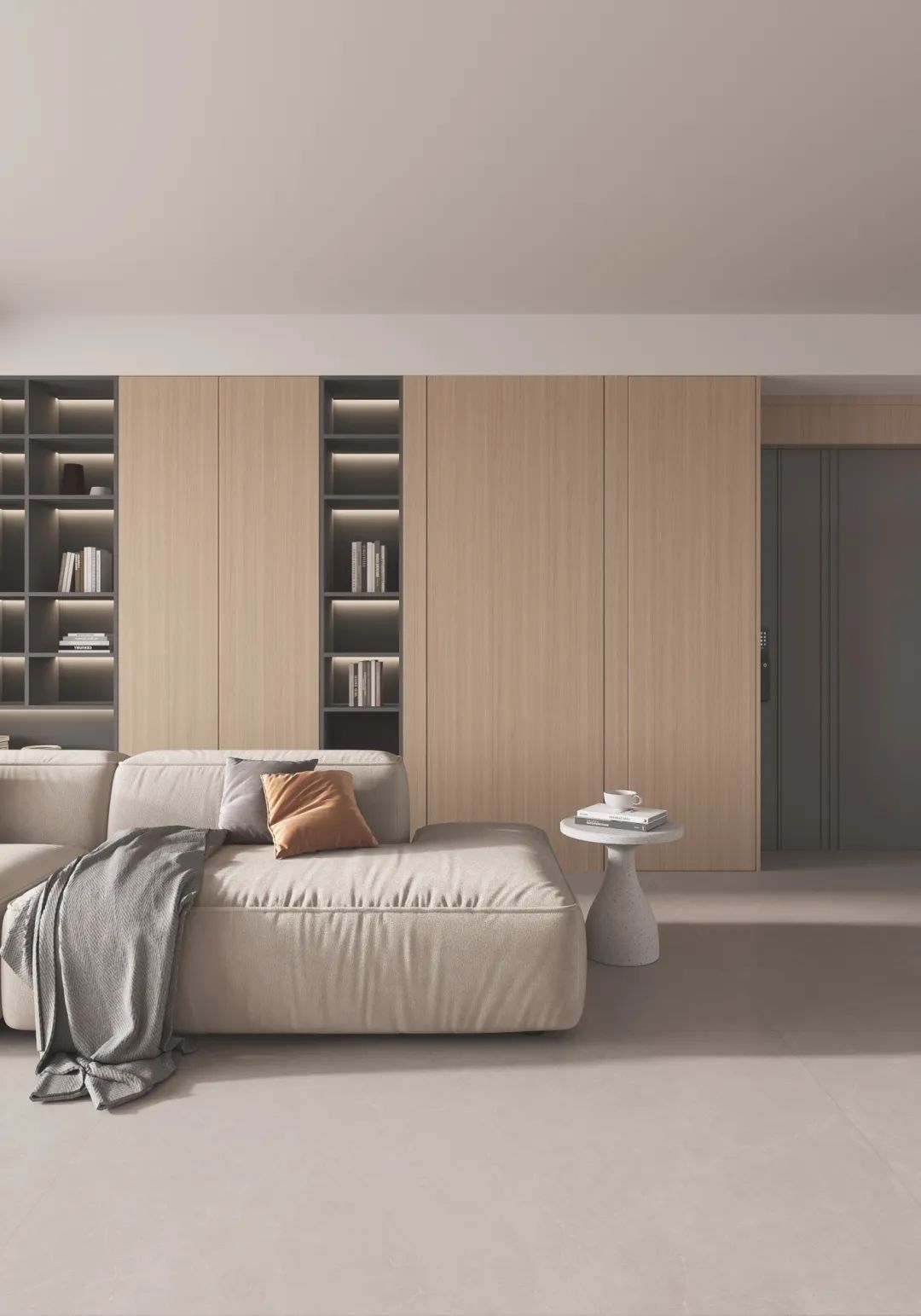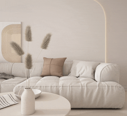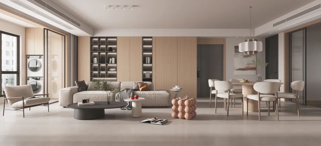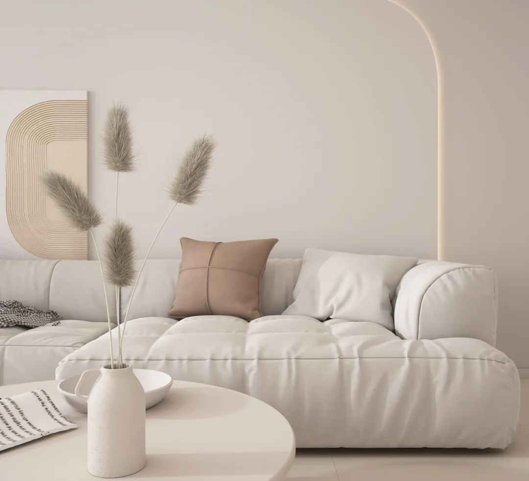 暖調空間適用素色柔光磚進行鋪貼,以奶白色、米色、原木色等暖調色彩奠定空間色彩基調,再配合天然棉麻、自然實木材質軟裝,奶油的配色和自然的肌理,更顯柔和質感,溫馨治愈感MAX。