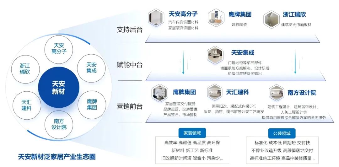 近幾年,在吳啟超董事長的帶領下,天安新材圍繞泛家居產業鏈,通過收并購等一系列戰略布局,整合行業優質資源,逐步構建起了一個涵蓋多個領域的泛家居產業生態圈,各業務板塊高度關聯、相互賦能,各子公司優勢互補、資源共享,進而向家居消費數據、工業化內裝和健康人居品牌的方向延伸,實現多品類多品牌融合發展。
