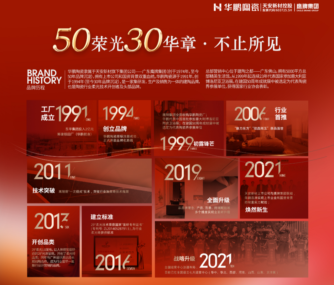 1991年,東平集團籌建銀田廠。1994年,華鵬陶瓷商標(biāo)注冊成功。1999年鷹牌集團全面收購華鵬陶瓷,2021年天安新材與鷹牌集團聯(lián)姻,華鵬被賦予國資背景上市企業(yè)雙血統(tǒng);2025年,華鵬陶瓷即將迎來品牌31周年慶!
