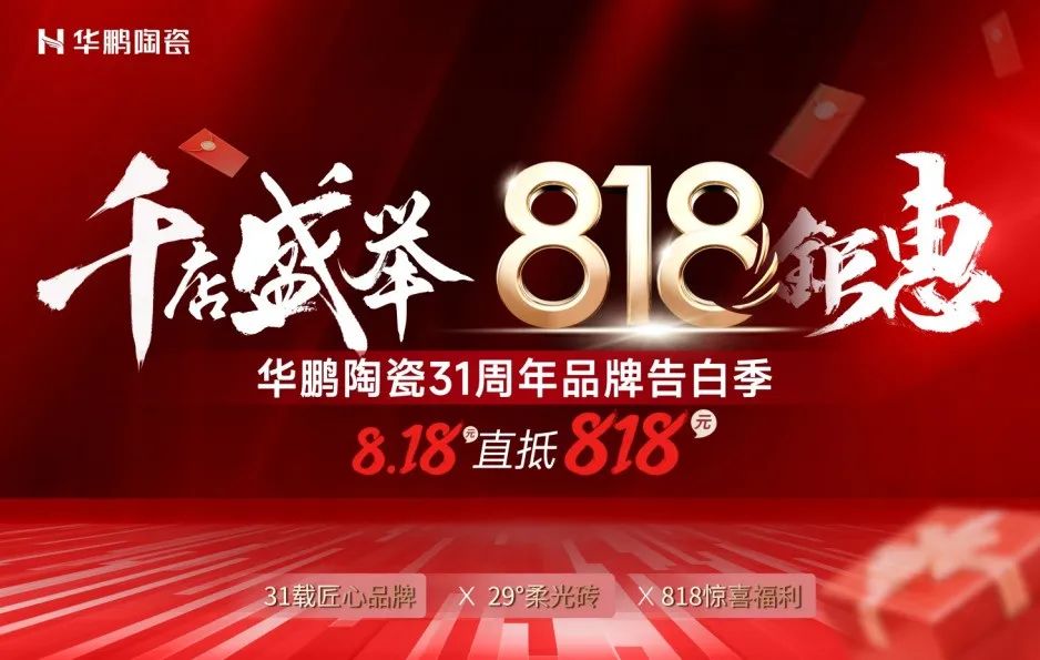 31 載同行,感恩有你。為回饋廣大消費者的信賴,華鵬陶瓷將于7月10日—8月31日舉行“千店盛舉 鉅惠818——華鵬陶瓷31周年品牌告白季”全國終端促銷活動,超多驚喜福利,讓裝修省錢又省心。
