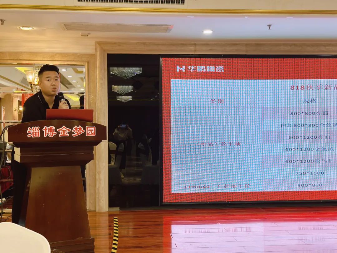 華鵬陶瓷淄博運營中心總經理徐學超在會議上對蒞臨現場的經銷商表示熱烈的歡迎與感謝,并表示,華鵬陶瓷始終以“做有價值的陶瓷產品,做有溫度的合作伙伴”為初心,回望淄博運營中心的發展,從最初的雛形搭建,到如今淄博運營中心總部扎根淄博,現已經基本完成了資源集聚、產品集成和市場集成的推進;同時華鵬陶瓷淄博中心倉投入使用,大大減輕了合作伙伴在倉儲方面的壓力,幫助經銷商實現小投入、大產出的盈利模式。未來,總部與淄博運營中心將結合江北市場實際情況持續就產品研發、渠道運營賦能、宣傳推廣、培訓體系打造等進行升級提升,持續為各位合作伙伴提供高性價比產品、高增長盈利模式。打造出淄博市場的“華鵬生態圈”—讓每一位選擇華鵬的伙伴,都能感受到“背靠大樹”的安心,也能收獲“共同成長”的紅利。