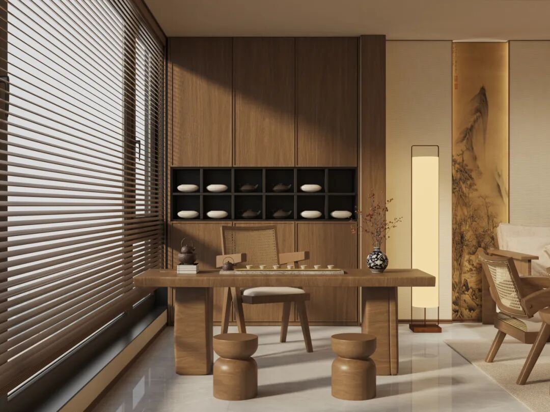 點睛之筆是綠色科技板·麻布素紋,素雅之中自帶古樸墨香,陽光通過窗戶光影錯落,氛圍感拉滿。綠色科技板優于實木,不開裂、防水防潮且無醛,長久留存東方雅致。